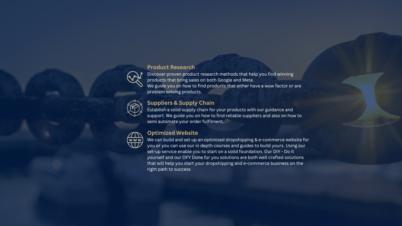 We can build and set up an optimized dropshipping & e-commerce website for you or you can use our in depth courses and guides to build yours. Using our set-up service enable you to start on a solid foundation. Our DIY - Do it yourself and our DFY Done for you solutions are both well crafted solutions that will help you start your dropshipping and e-commerce business on the right path to success